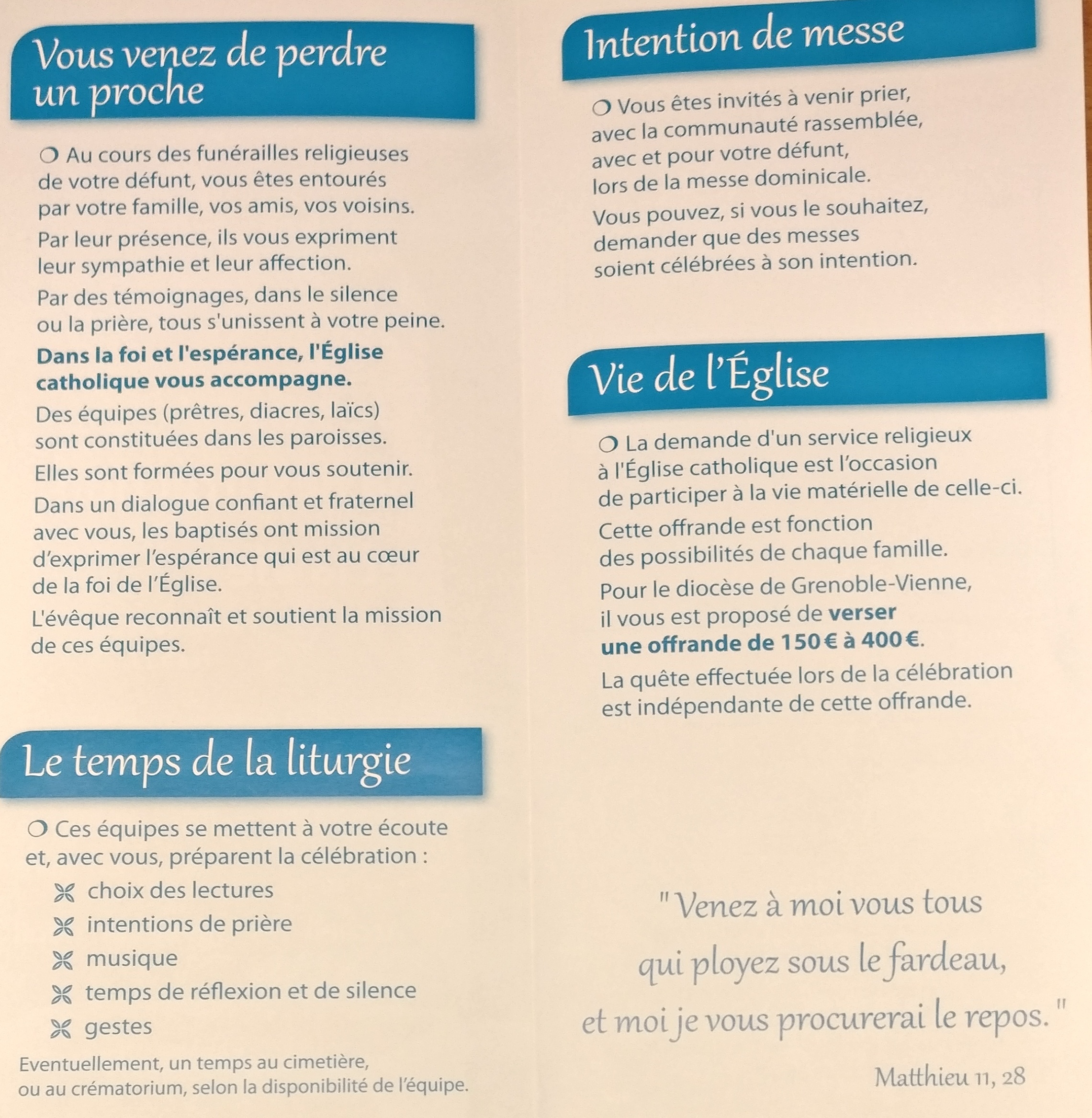 ... Depuis le 1er février 2018, l'Eglise catholique en Isère souhaite que les églises soient à nouveau le lieu normal des funérailles.Vous serez ainsi en contact avec la communauté catholique qui se trouve près de chez vous ; celle-là même que vous pouvez rencontrer à différents moments de votre vie : baptême, messe, mariage, etc ...